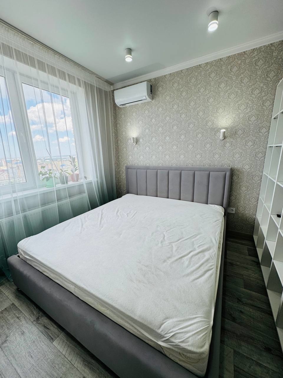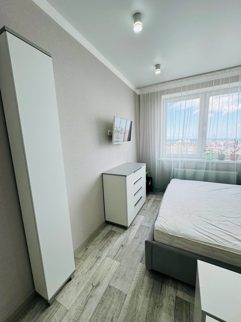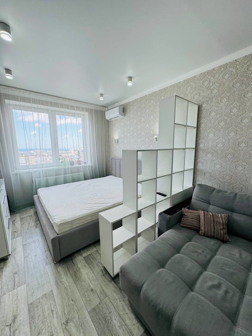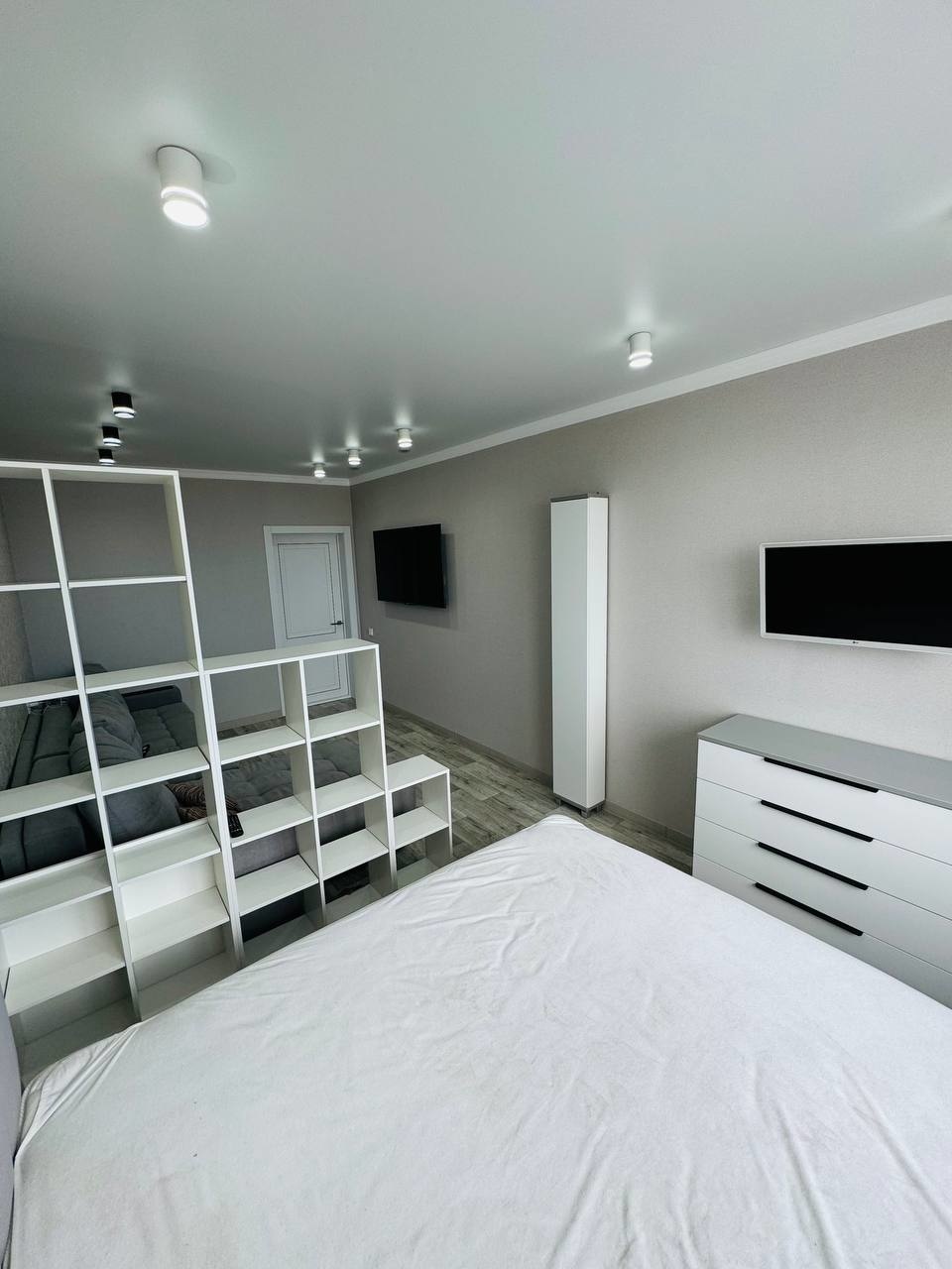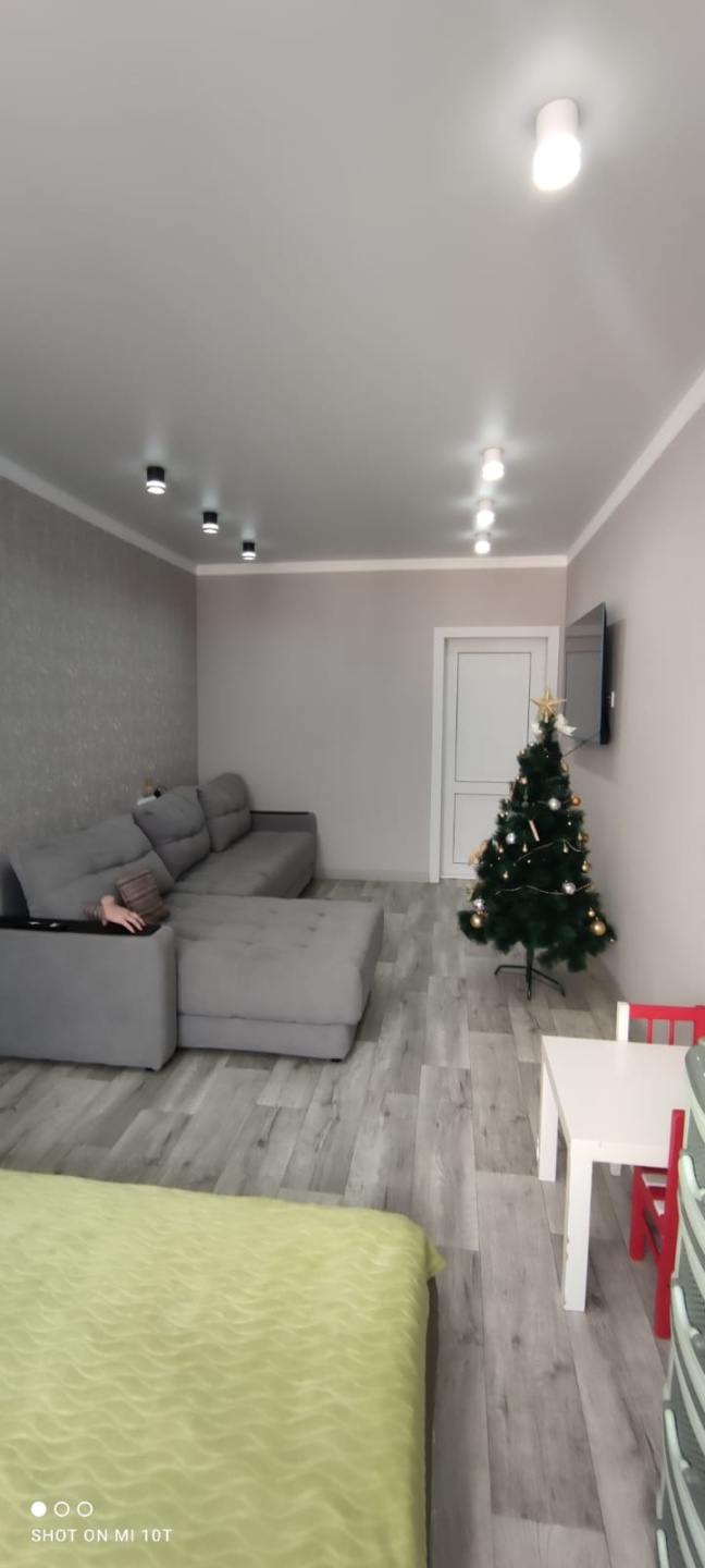 Большая комната 19 кв м, в ней планировалось две зоны, спальная зона с телевизором и гостиная зона с большим телевизором, установлена потолочная закладная можно сделать перегородку..