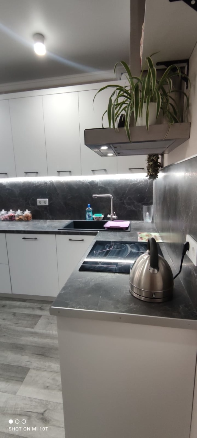 В кухне, установлена, кухонный гарнитур, выполнялся под заказ, встроенная индукционная панель на 4 конфорки, , вытяжка.