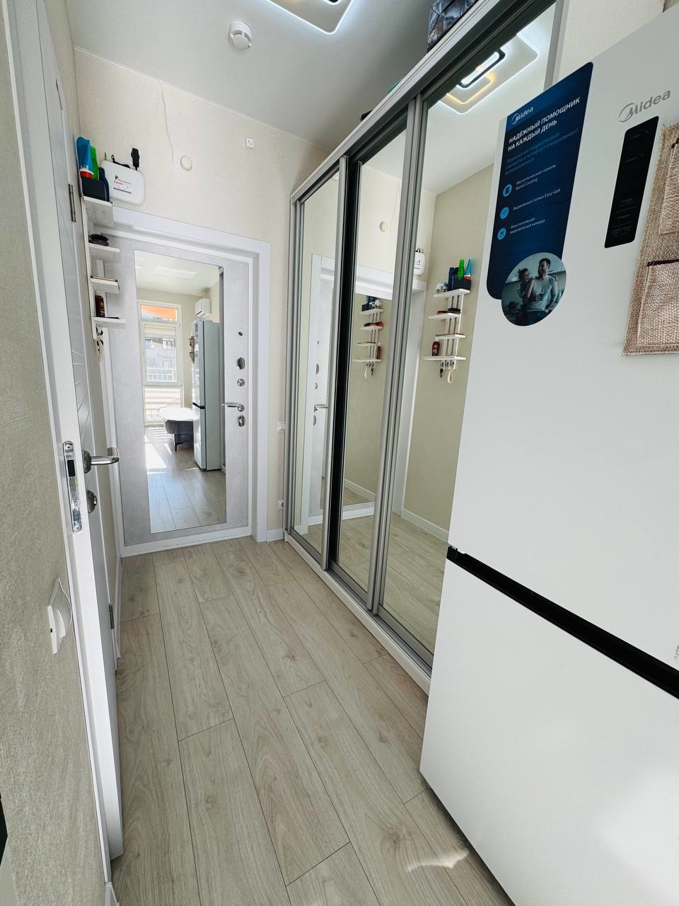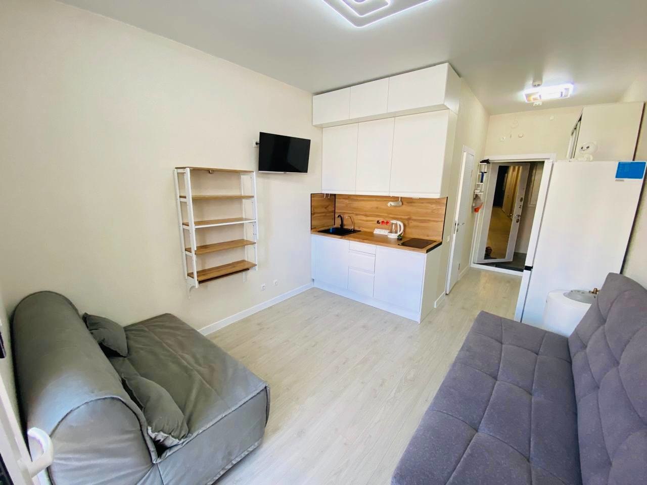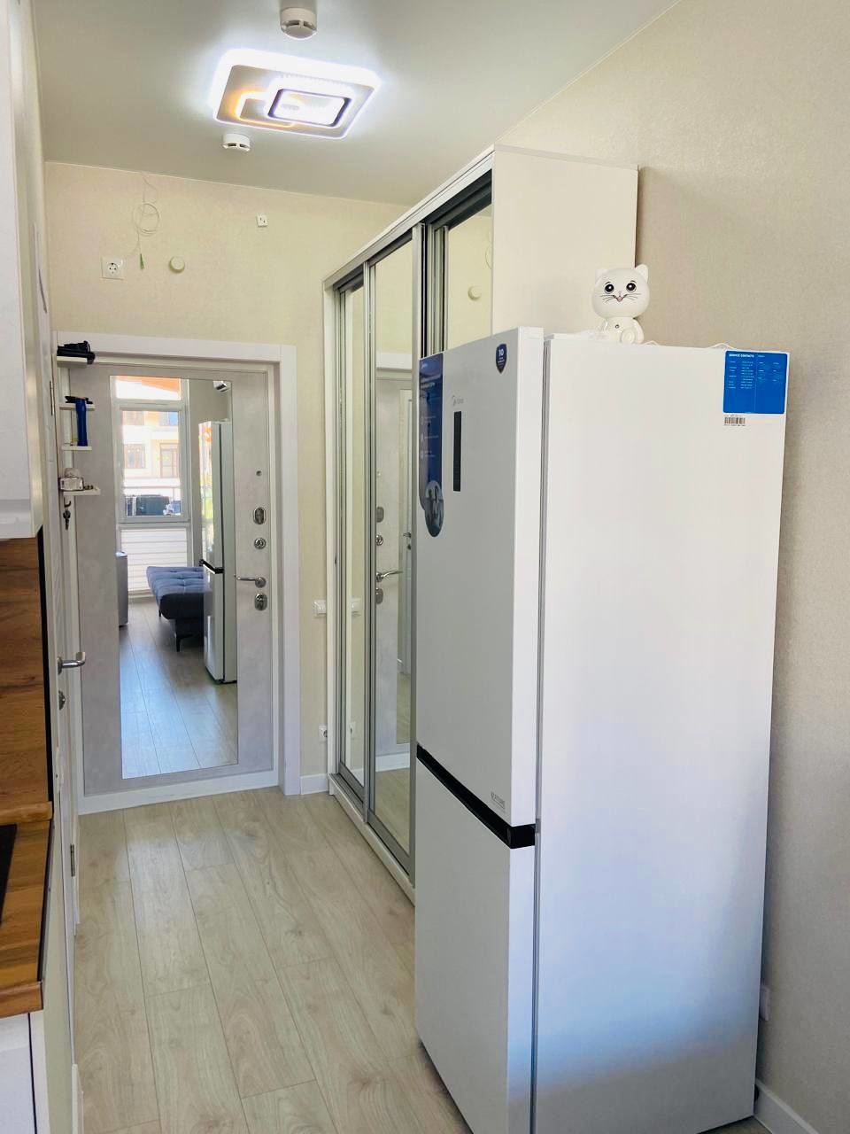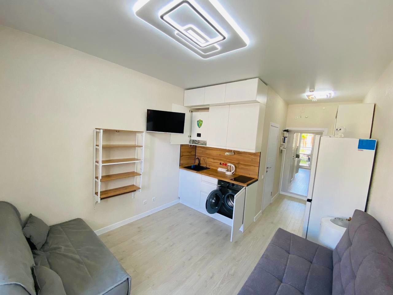 В квартире есть вся необходимая мебель и техника, для комфортного проживания, или сдачи. Кухонный гарнитур сделан на заказ, под размеры кухни, бойлер и стиральная машина спрятаны в кухонный гарнитур, два раскладных дивана позволят разместиться четверым, при входе большой шкаф купе. Остается все, кроме садовой мебели.