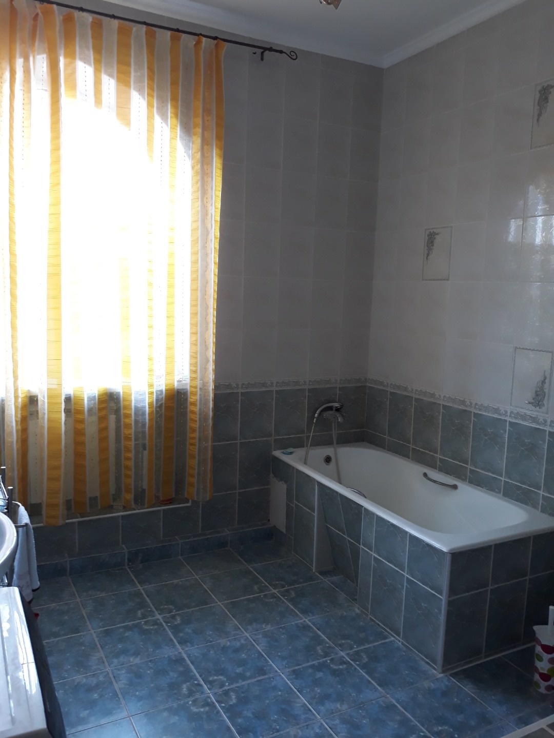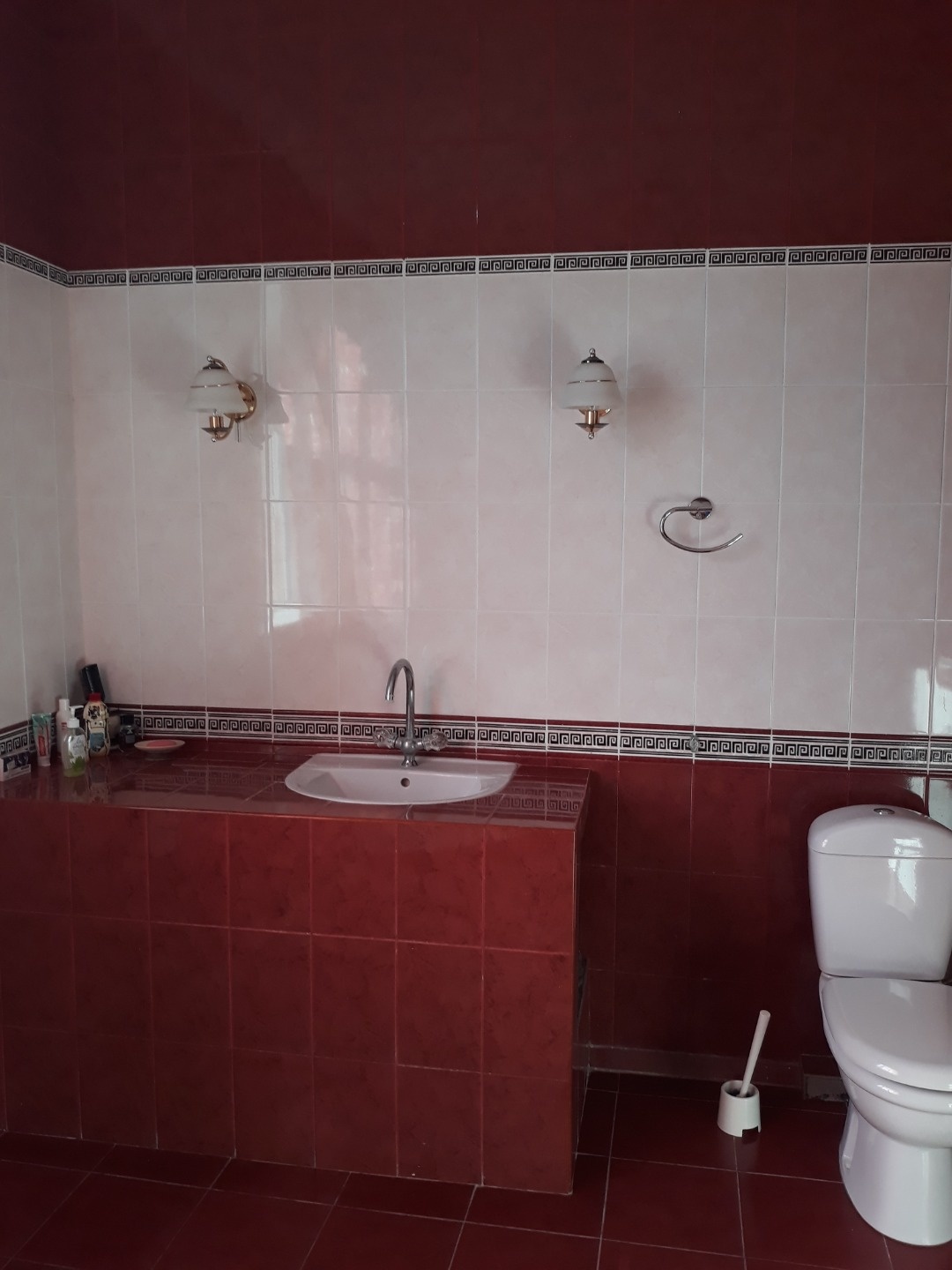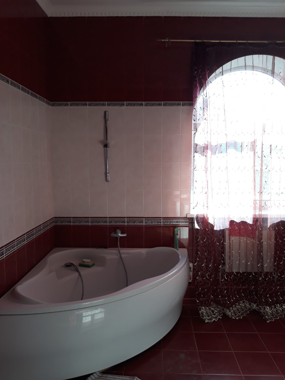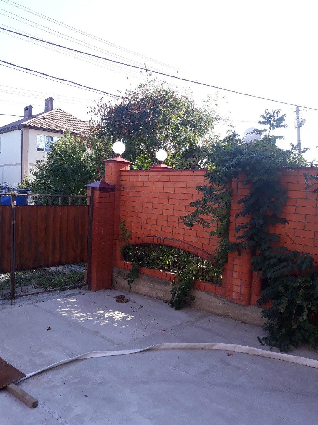 Толщина стен дома 40 см, высота потолков 3,50 м. Центральное водоснабжение, центральная канализация, газ. Дом построен из блока и облицован красным итальянским кирпичом. Двор забетонирован, имеются места для 3 машин. Возможность раздела земли и строительство еще одного дома на участке. По всему периметру забор.