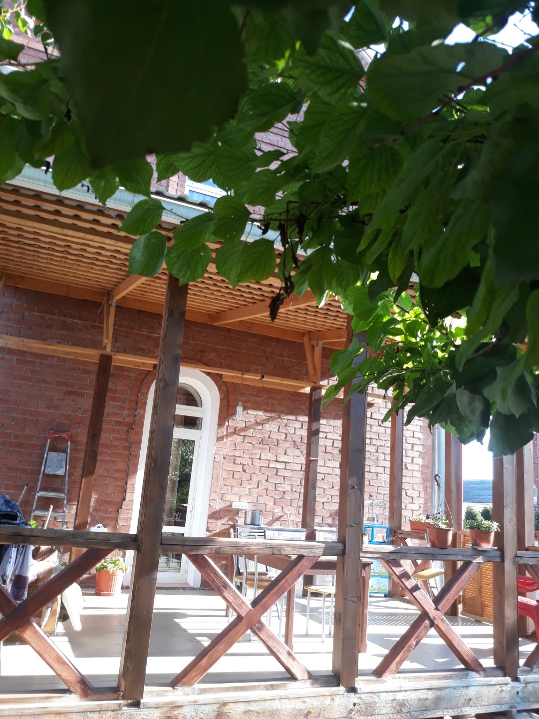 - 1 этаж: прихожая, просторная кухня-столовая 46,5 кв.м., комнаты 23,4 кв.м. и 32,4 кв.м., гардеробная, ванная комната 9,2 кв.м., второй выход из дома на деревянную веранду.